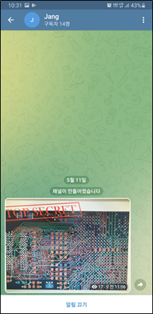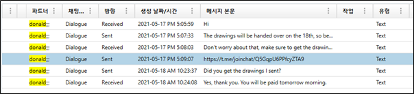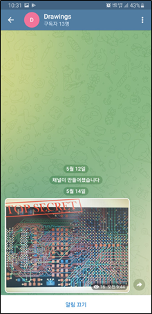 다음은 홍길동과 Donald의 텔레그램 채팅 기록에서 발견된 Drawings 텔레그램 채널에 접속한 화면이다. 텔레그램 채널은 일반적으로 개설자만 내용을 전송할 수 있으며 지우지 않는다면 계속 남아있게 된다. 아래 이미지는 대회가 진행되고 있는 동안에 해당 채널에 접속하여 캡쳐한 이미지이다. 홍길동이 해당 채널에 도면을 2021-05-18 AM 10:22에 업로드한 것을 확인할 수 있다.
