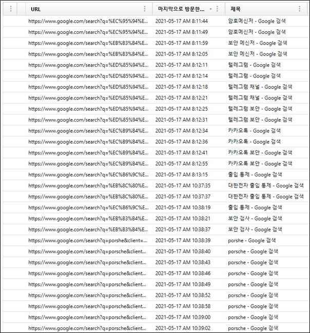 크롬 브라우저 방문 기록은 다음과 같다. 2021-05-17에 암호메신저, 보안 메신저, 텔레그램 보안, 카카오톡, 출입 통제, 포르쉐 등을 검색했다.