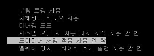 실행 후 게스트를 재시작 하라는 메시지를 통해서 재시작을 진행할때, F8을 통해서 "드라이버 서명 적용 사용 안 함"으로 부팅을 해야 커널 디버깅이 가능하다.