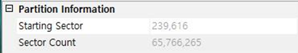 현재 [그림 6] 을 통해서 파티션 3번의 시작 섹터는 239,616 으로 확인 할 수 있었으며, 파티션 4 번 66,007,040 을 통해 파티션 3의 총 섹터는 239,616 ~ 66,007,039 으로 확인 할 수 있다.
