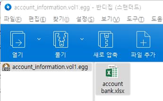 분할 압축에서는 일부 egg 파일이 사라져도 1번파일에는 해당 압축에 어떠한 파일이 있는지 확 인 할 수 있다. 해당 압축파일에는 account bank.xlsx 파일을 확인 할 수 있다.