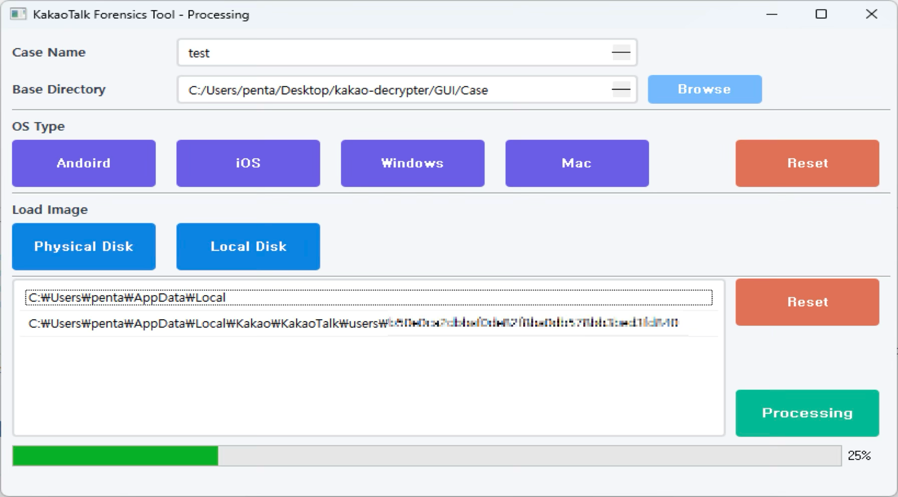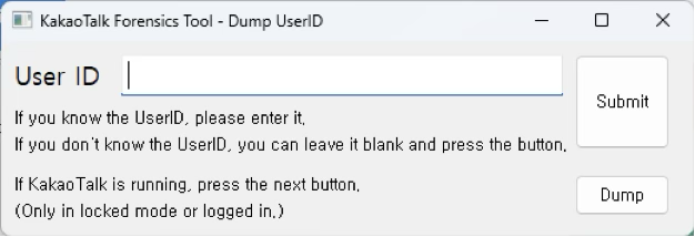 라이브 환경에서의 프로그램 실행은 메모리 덤프 및 무차별 대입 알고리즘을 통해서 수십초 내로 획득이 가능하지만, 예를 들어 KakaoTalk\Users\~~~~ 폴더를 따로 선택한다면, SYS_UUID, HDD_Model, HDD_Serial 을 수동으로 입력해야합니다.
