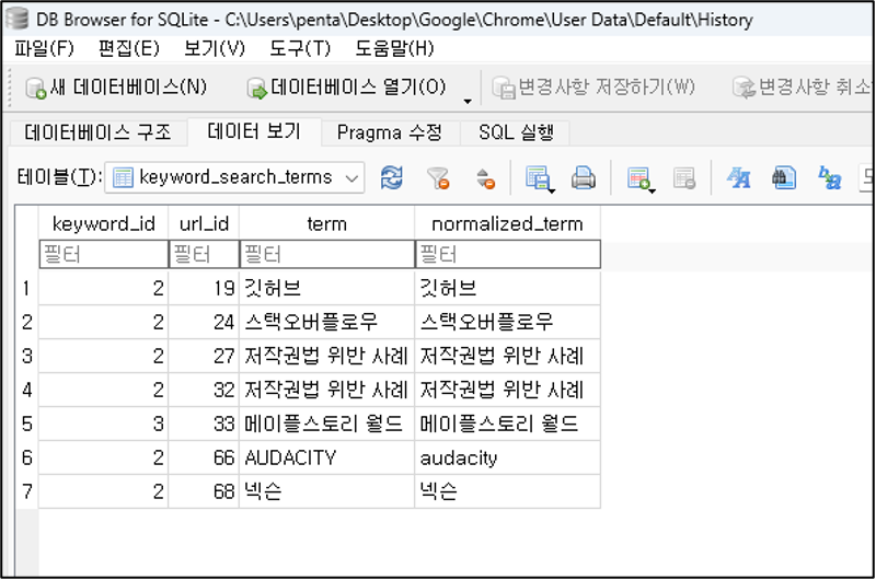 그림 13 Chrome 키워드 검색 목록 테이블 (keyword_search_terms)