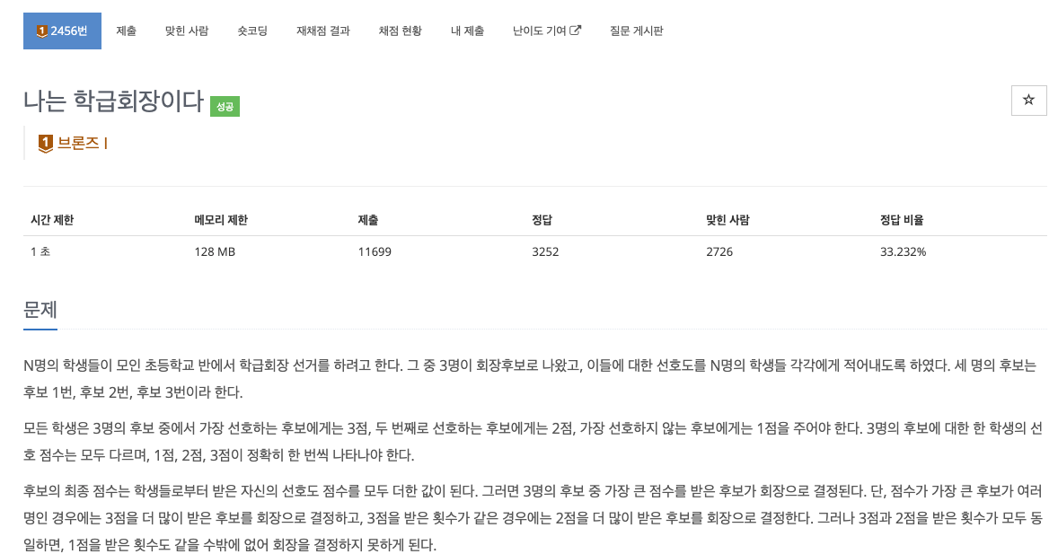 # 백준 2456 - 나는 학급회장이다