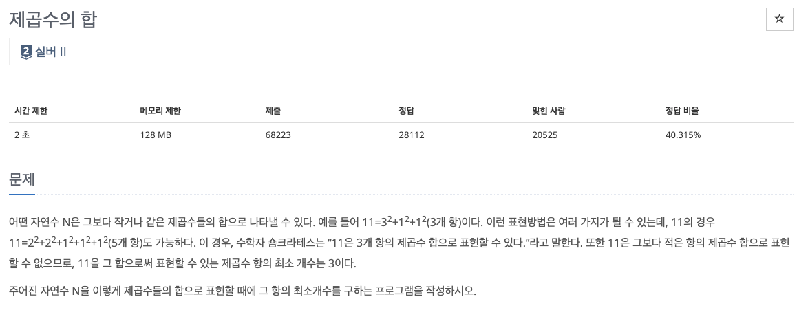 자연수 N이 주어졌을 때, N을 제곱수들의 합으로 표현하는 데에 필요한 최소 항의 수를 구하는 문제이다.