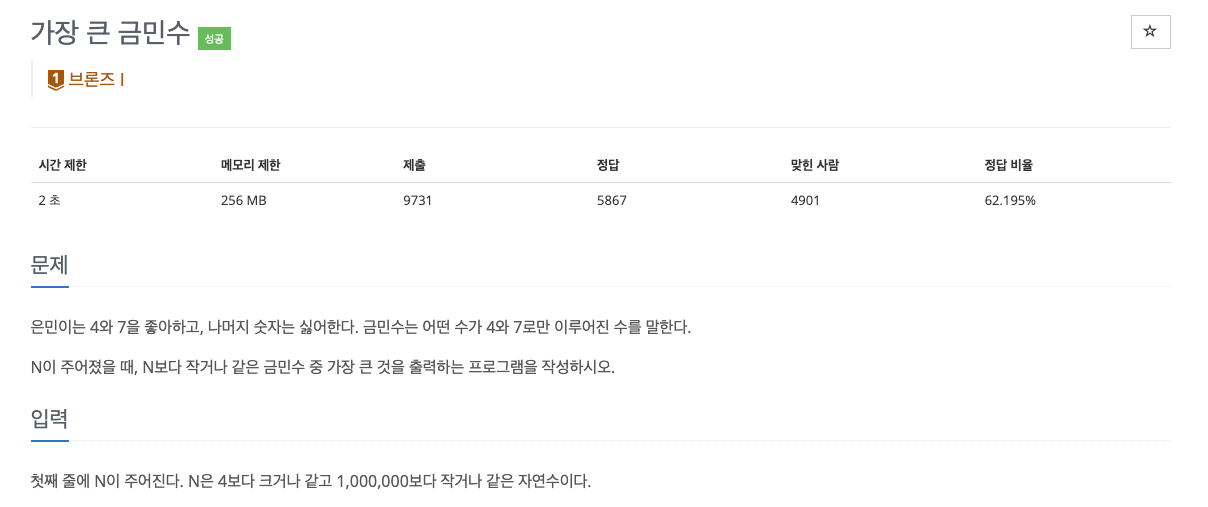 금민수란 숫자는 4또는 7로만 이루어진 수이다. 입력으로 주어지는 N이하의 수 중에서 가장 큰 금민수를 출력하는 문제이다.