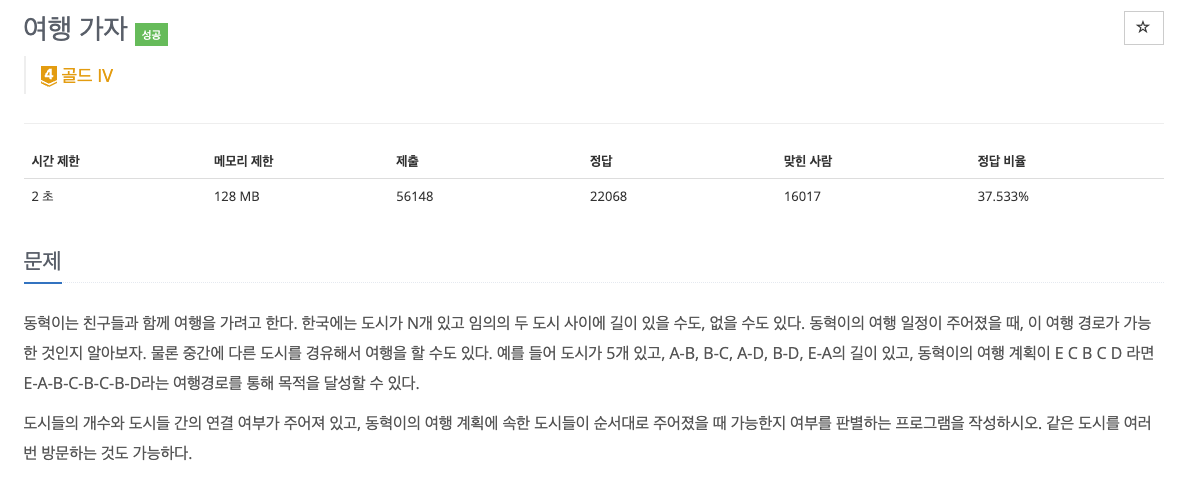 - 주어진 도시들이 모두 같은 연결 요소에 속해 있다면 여행이 가능하다.
