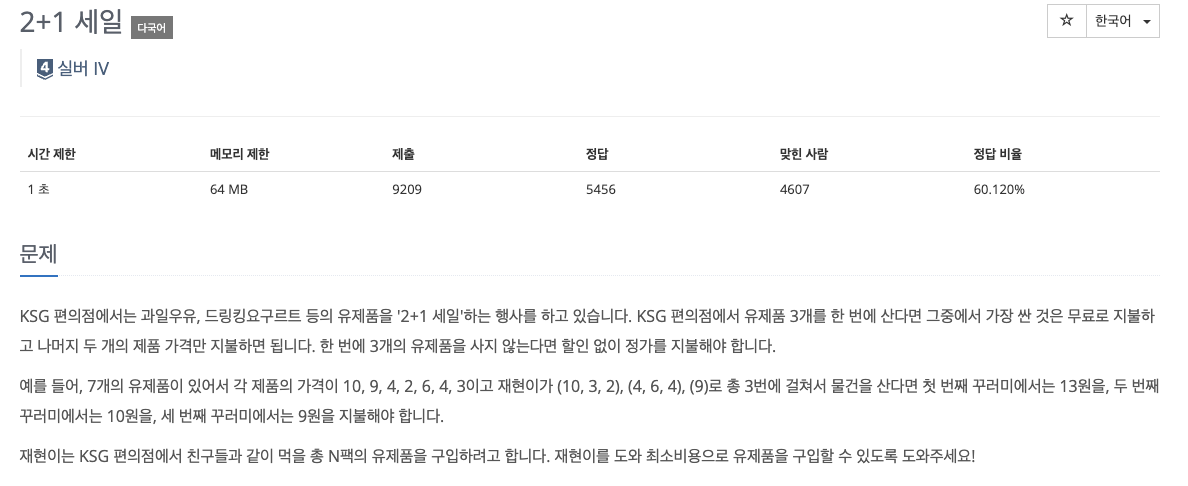 - 2 + 1세일은 물건을 세개 살때 가장 싼 한개는 무료로 적용한다.