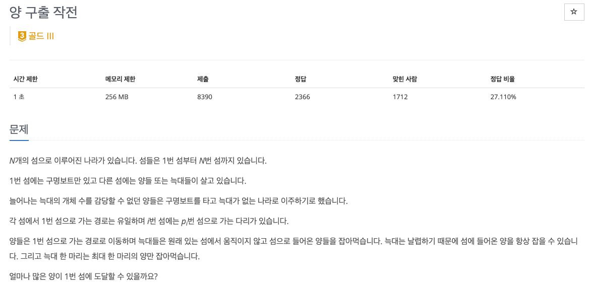 - 목표: 1번 섬(루트)에 도착할 수 있는 양의 최대 수 구하기