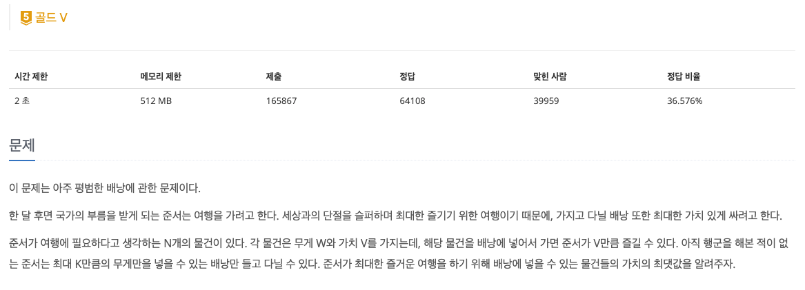 [골드 5] 백준 12865 - 평범한 배낭 (파이썬)