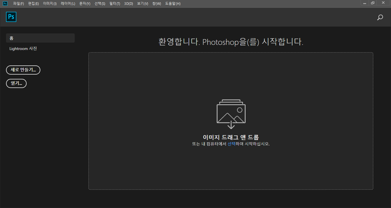 포토샵을 실행시켜 줍니다. (필자는 Adobe Photoshop 2019 를 사용하지만 다른 포토샵 프로그램을 이용하셔도 됩니다.)