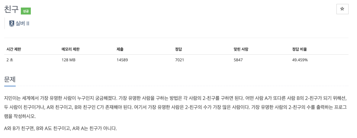 - 직접 친구이거나 친구의 친구(2-친구)까지를 포함해 가장 많은 친구 수를 가지는 사람을 찾아 그 수를 출력