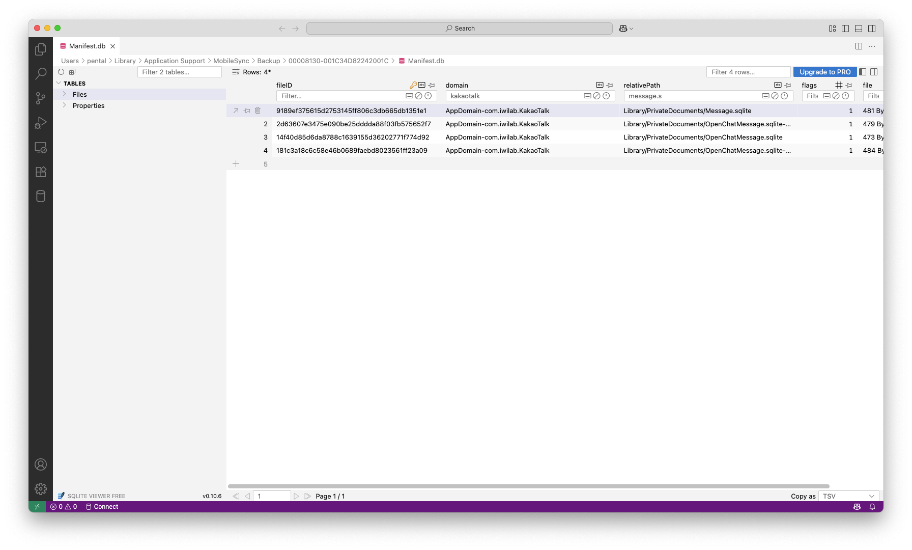 Manifest.db 파일에서 Kakaotalk 메시지 데이터베이스 파일의 위치를 확인 할 수 있다.