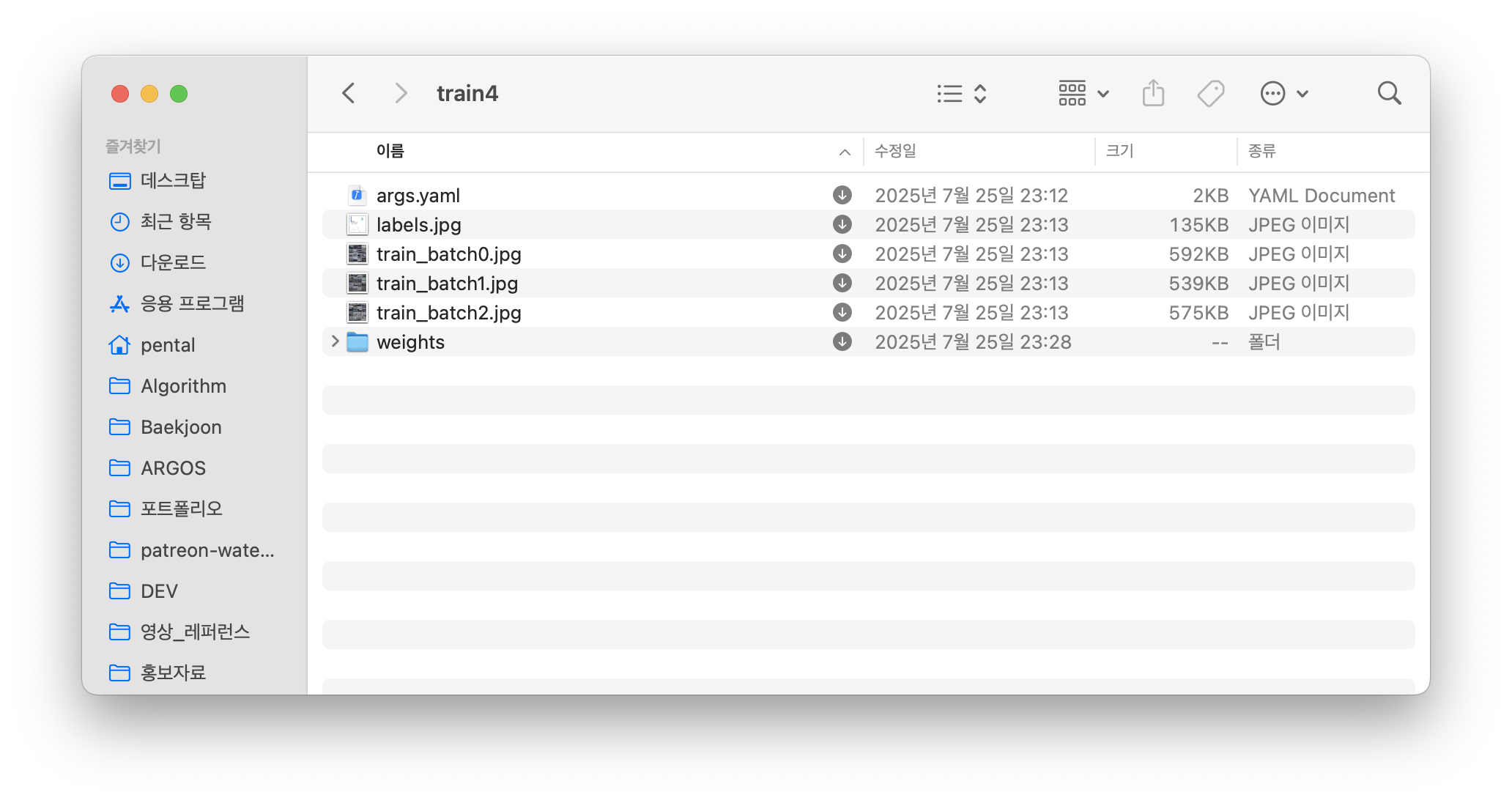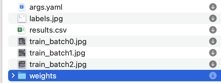 학습이 완료되면, runs 폴더 아래 train의 마지막 폴더에 weights 폴더가 존재한다.