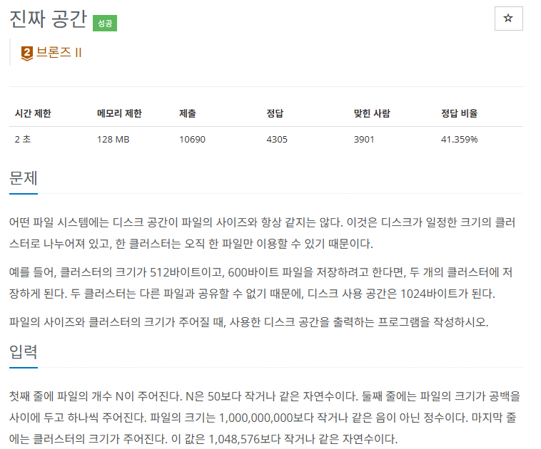 파일 시스템을 공부하는 나에겐 재밌는 문제이다. 먼저 이 문제는 파일 시스템에서는 디스크 공간이 파일 사이즈와 항상 같지 않고, 디스크가 일정한 크기의 클러스터로 나뉘어져있고, 한 클러스터는 오직 한 파일만 이용할 수 있다고 한다.