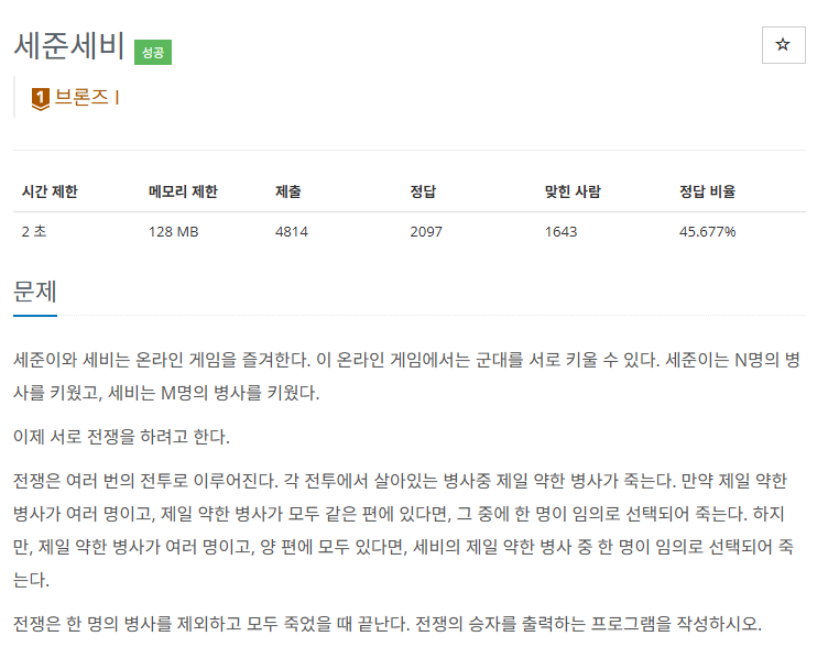 아래 코드는 내가 작성하였지만 사실 이 문제는 시뮬레이션을 다 돌릴 필요가 없는 문제이다. 규칙상 세준이의 최약제 >= 세비의 최약체 라면 세비만 계속 죽기 때문이다.