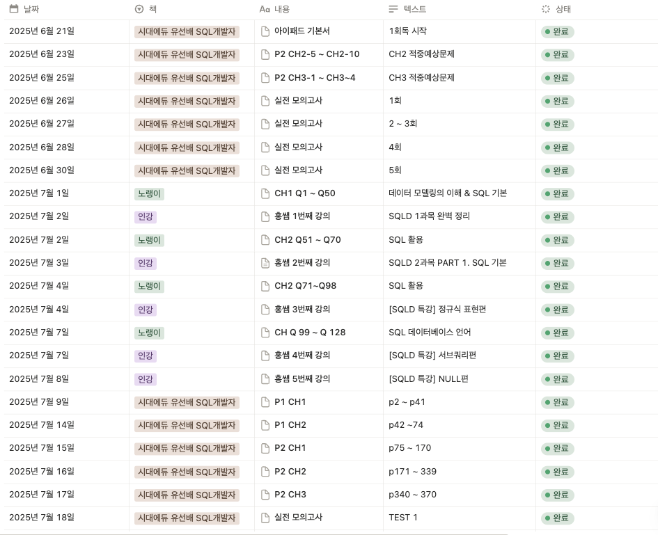 - 7월 28일~8월 21일: 노랭이 + SQLD.KR 모의고사 반복 풀이 (점수 50점대 → 90점대 상승!)