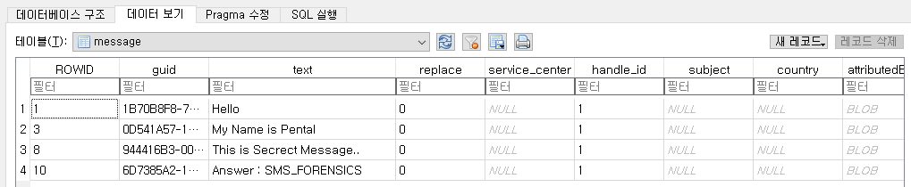 message 테이블에는 평문으로 저장된 문자 메시지를 확인 할 수 있습니다.