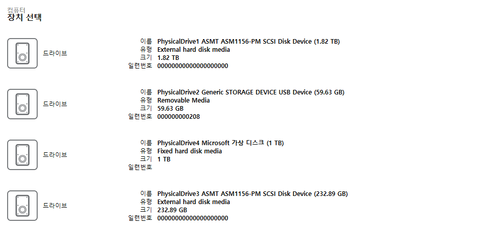 - 해당 옵션은 HDD, SSD, USB 및 SD 플래시와 같은 다양한 유형의 드라이브에 사용할 수 있다. Magnet AXIOM Process는 Windows, Linux 또는 OS X을 실행하는 드라이브를 지원한다.