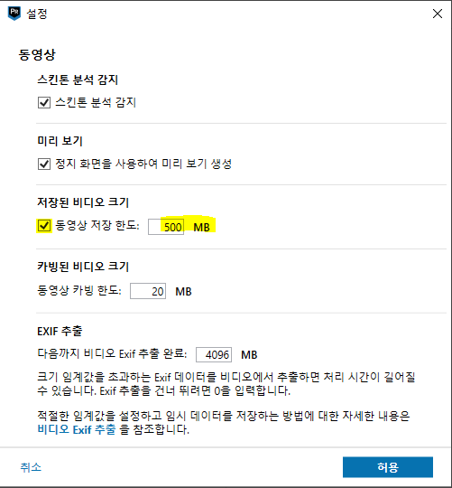 3. 최대 비디오 저장 확인란을 선택하고 Magnet AXIOM Process를 사용하려는 비디오의 최대 크기를 지정