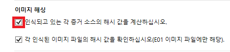 2. 이미징 > 이미지 해싱 섹션에서 수집 중인 각 증거 소스에 대해 해시 값 계산 확인란을 선택