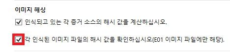 또한 이미지 압축 여부, 해시 값 작성 여부 등과 같은 검사 실행 방법을 설정할 수 있다.