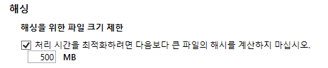 2. 해싱 > 해싱 파일 크기 제한 섹션의 처리 시간 최적화, 파일보다 큰 파일의 해시 계산 안 함 확인란을 선택